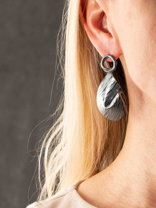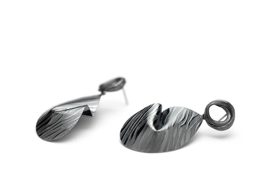 The earrings are made of silver. The surface is finished with the unique pattern and is patinated.