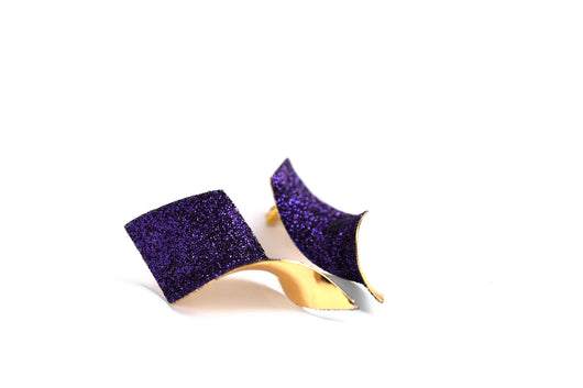 Shades Rhombus Sparkling earrings are made of silver and are gold-plated. Each earring is transformed from a single piece of metal into an elegant twisted form using only a hammer and stake. The surface is covered with the blue glitter. All earring posts and clutches are made of the sterling silver (925).
